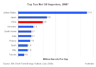 After Coal, oil is the major source of energy for China. As the following charts show, China was the 3rd largest importer of oil in 2008 and majority of the imports come from the middle east.