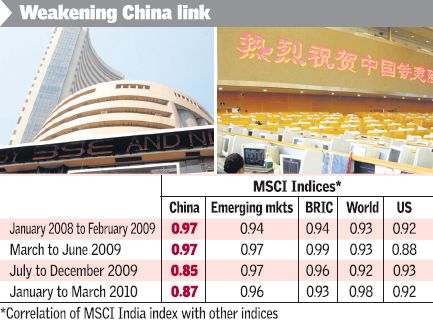 Stocks in India re moving in lock step with global markets.In the past 3 months however they have started to decouple a bit from the performance of Chinese markets. India, BRIC and emerging markets are still closely related to the US markets based on the data for the first three months of this year.However Chinese equities are showing some variance from global markets primarily due to the Chinese government’s policies to cool down the over-heated economy and rein in liquidity.